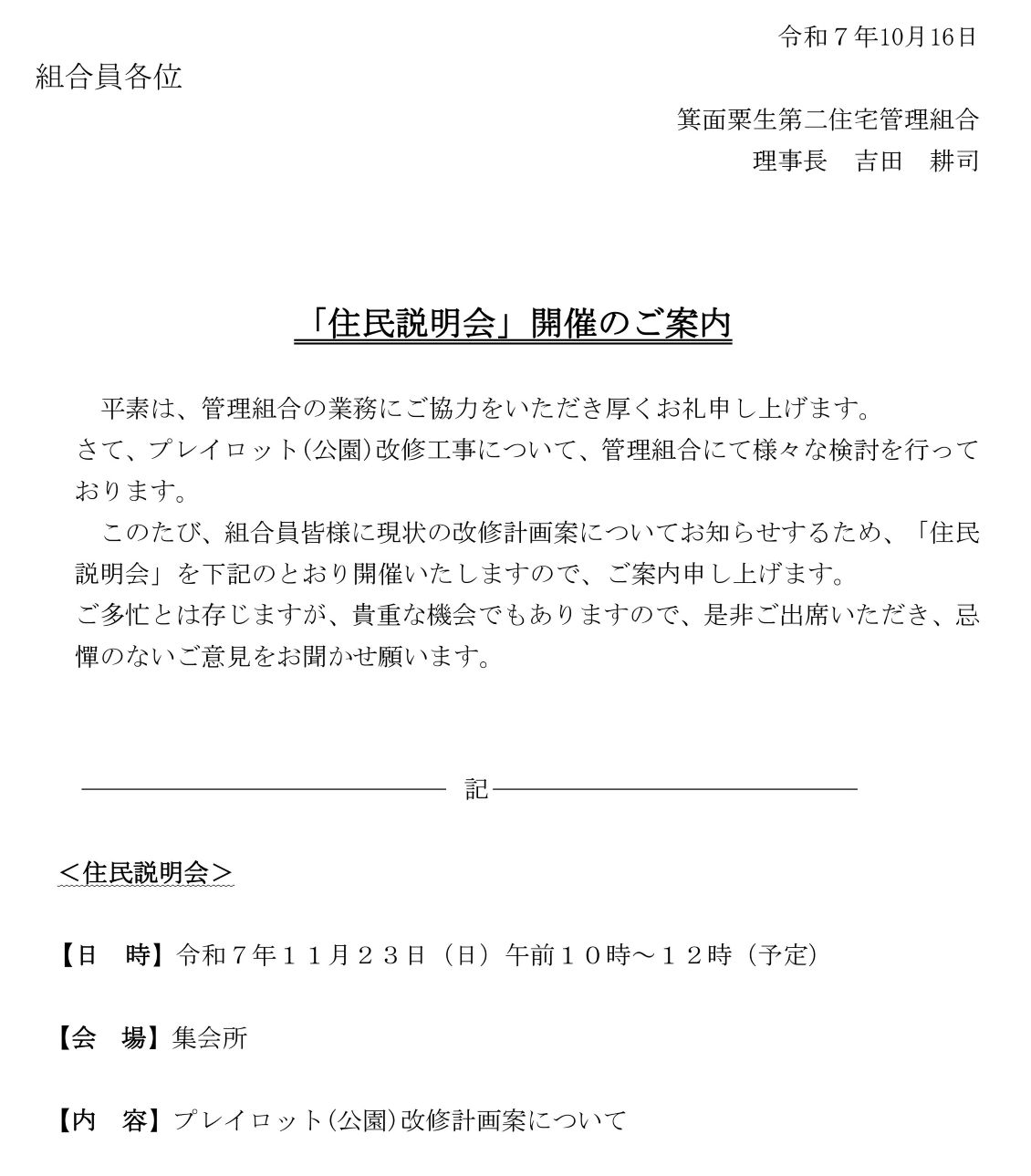 「プレイロット(公園)改修計画案の住民説明会」開催のご案内